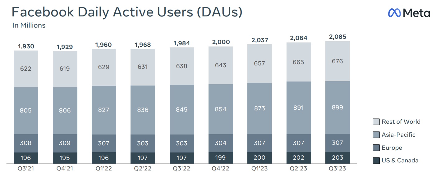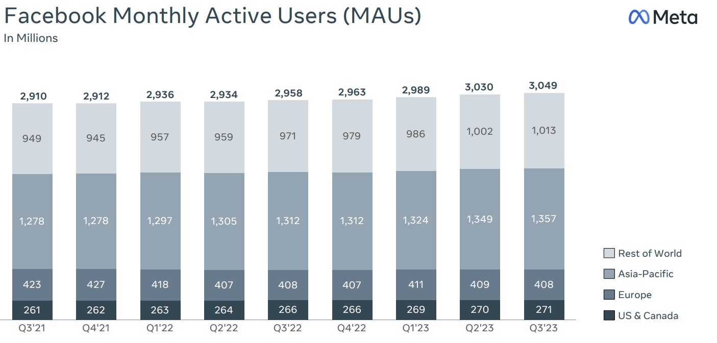 在去年四季度,Meta旗下最大规模社交平台Facebook的每日活跃用户数(DAU)史上首次达到20亿,此后一再创新高,在第三季度DAU则达到20.85亿,刷新第二季度所创的单季最高纪录。第三季度Facebook的月度活用户数(MAU)则继第二季度史上首次突破30亿大关后,达到30.49亿,高于分析师预期。
