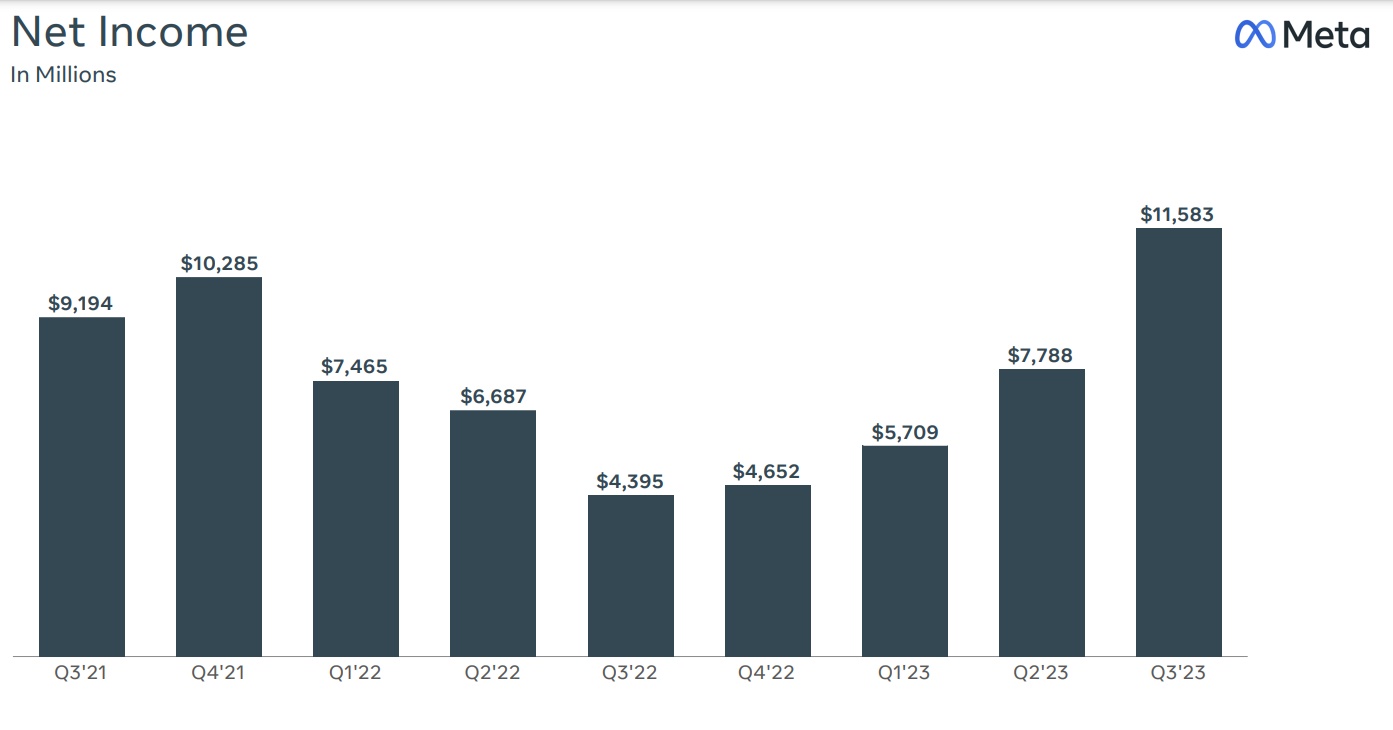 自去年以来开启的削减成本模式和公司架构扁平化浪潮,使得Meta的营业利润率从去年同期的20%激增到40%。Meta第三季净利润约为116亿美元,合每股收益4.39美元,上年同期仅仅为1.64美元,该公司净利润已经呈现出明显的回升态势,目前净利润水平已经超过2021年第一季度。