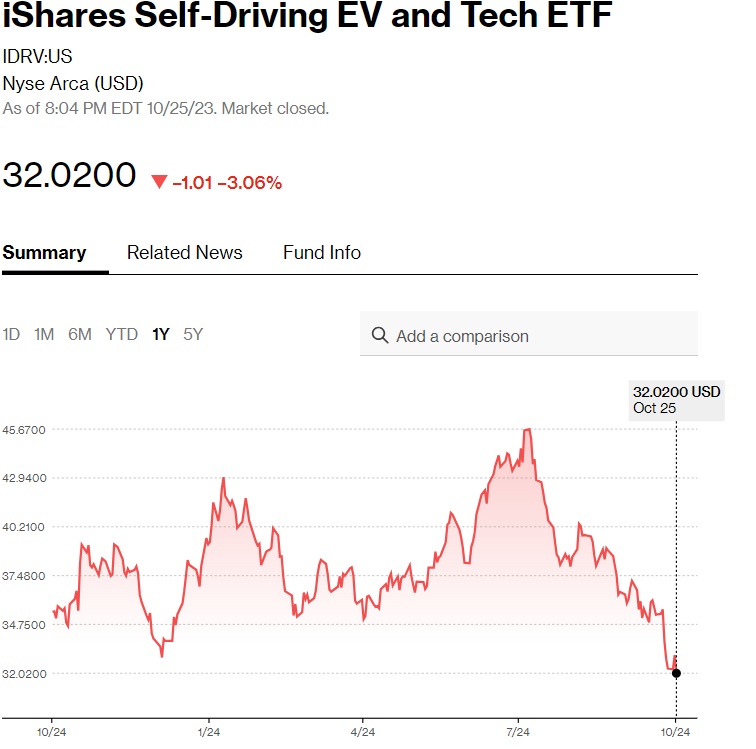 股票市场的投资者们已经对电动汽车前景做出完全负面的回应。过去三个月,涵盖特斯拉、Rivian等电动汽车领导者的iShares自动驾驶电动车与技术ETF(iShares Self-Driving EV and Tech ETF)的跌幅接近30%,同期跌幅远远超过全球股市风向标——MSCI ACWI Index约8%的跌幅。