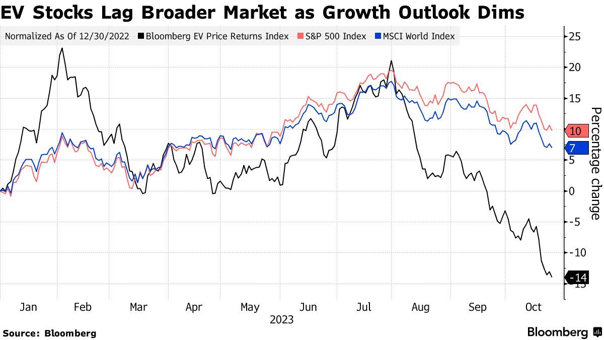更详细的数据显示,在今年年初领涨美股大盘之后,美国电动汽车股票已开始暴跌。自10月18日特斯拉公布业绩以来,追踪全球电动汽车股票的彭博电动汽车价格回报指数(Bloomberg EV Price Return Index)下跌近7%,而美股基准指数——标普500指数(S&P 500 Index)的跌幅仅为2.5%。