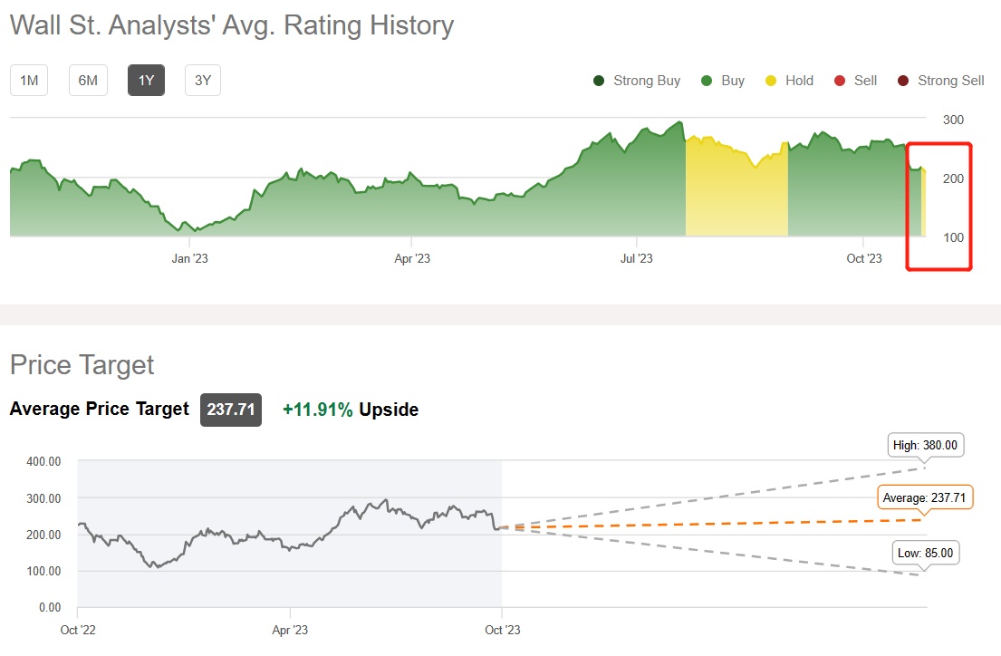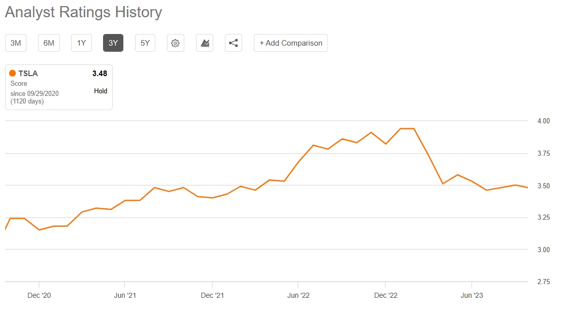 此外,Seeking Alpha统计数据显示,特斯拉的分析师评级分数自今年以来不断下滑,很大程度上能够反映出华尔街对这家电动汽车领导者盈利前景的不安情绪。目前特斯拉Analyst Ratings仅仅为3.48(满分为5分,相比之下英伟达与微软这一分数接近5),反映出越来越多的分析师将特斯拉评级由“买入”下调至“谨慎持有”或者“卖出”。