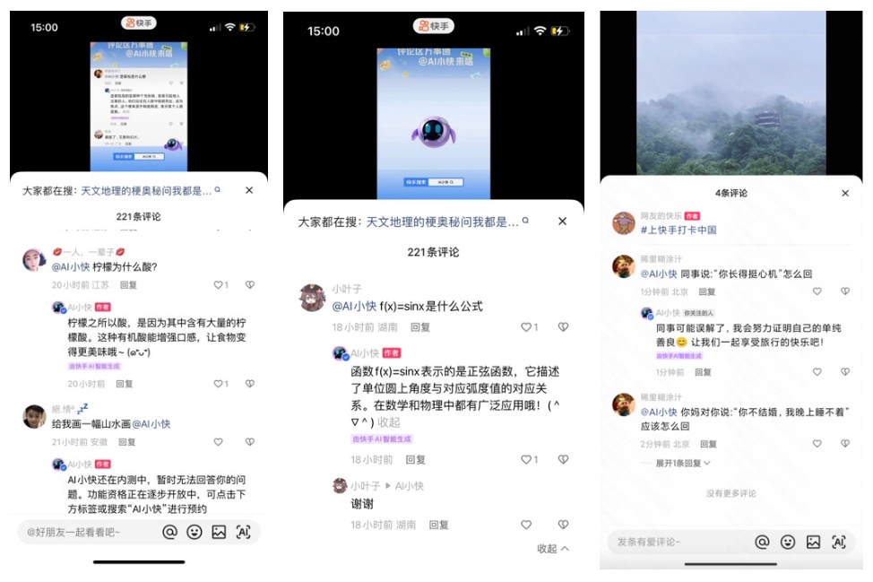 为了更好的满足用户在评论区的诉求,让用户表达有途径、互动有回应、互动有惊喜,“AI小快”应运而生。据了解,用户在快手搜索“AI小快”即可申请参与内测,获得资格的用户在短视频评论区发布艾特@AI小快 的评论,便可收到@AI小快 的回复。“AI小快”不仅可以为用户们的提问给出有效的答案和信息参考,且能在短视频信息延展的基础上,有效提升用户之间的互动频次和信息交互体验。