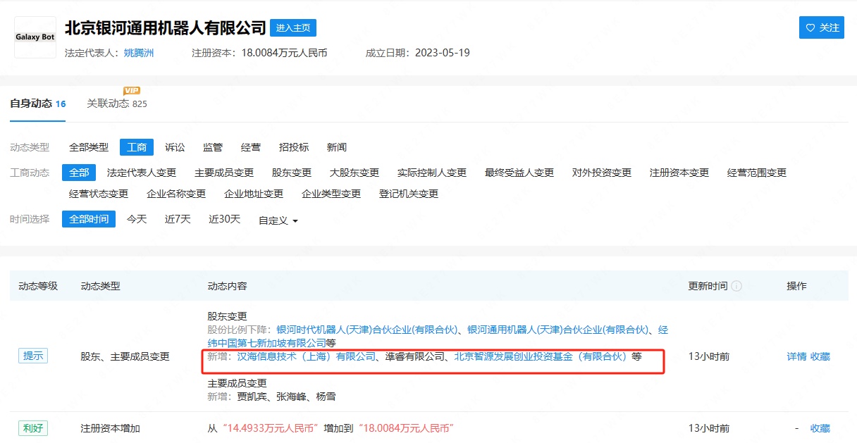 智通财经APP获悉,企查查APP显示,近日,北京银河通用机器人有限公司(下称:银河通用机器人)发生工商变更,新增美团旗下汉海信息技术(上海)有限公司、北京智源发展创业投资基金(有限合伙)等为股东,同时公司注册资本由约14万人民币增至约18万人民币。
