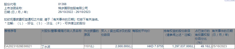 智通财经APP获悉,香港联交所最新资料显示,10月25日,特步主席兼行政总裁丁水波增持特步国际(01368)200万股,每股作价7.0755港元,总金额约为1415.1万港元。增持后最新持股数目约为12.97亿股,最新持股比例为49.16%。