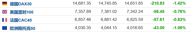 2.截至发稿,德国DAX指数跌1.42%,英国富时100指数跌0.76%,法国CAC40指数跌0.83%,欧洲斯托克50指数跌1.06%。