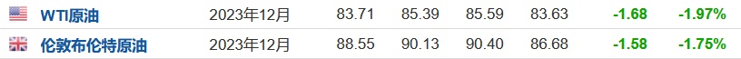 3.截至发稿,WTI原油跌1.97%,报83.71美元/桶。布伦特原油跌1.75%,报88.55美元/桶。