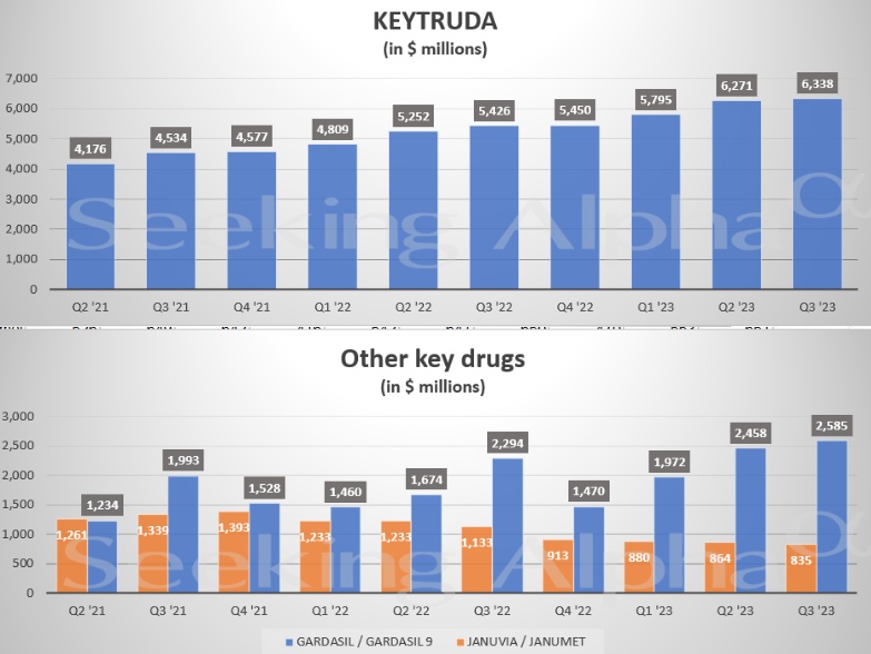 其他重要产品的季度销售情况好坏参半。例如,HPV 9价疫苗Gardasil三季度销售额为25.9亿美元,同比增长13%,与预期基本一致。治疗糖尿病的Januvia和Janumet的总销售额达到8.35亿美元,超出预期,但同比下降26%。默沙东公司的肺炎球菌疫苗Vaxneuvance的销售额为2.14亿美元,远高于华尔街预期的1.67亿美元。