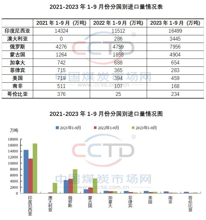 从我国主要进口煤来源国数据来看,2023年1-9月,我国从澳大利亚、哥伦比亚、蒙古国、俄罗斯、南非、印度尼西亚和美国进口煤炭数量同比均出现明显增加,同比涨幅分别为1107%、841%、164%、67%、56%、43%和17%。但今年前三季度,我国从菲律宾和加拿大进口煤炭数量同比分别减少了23%和5%。
