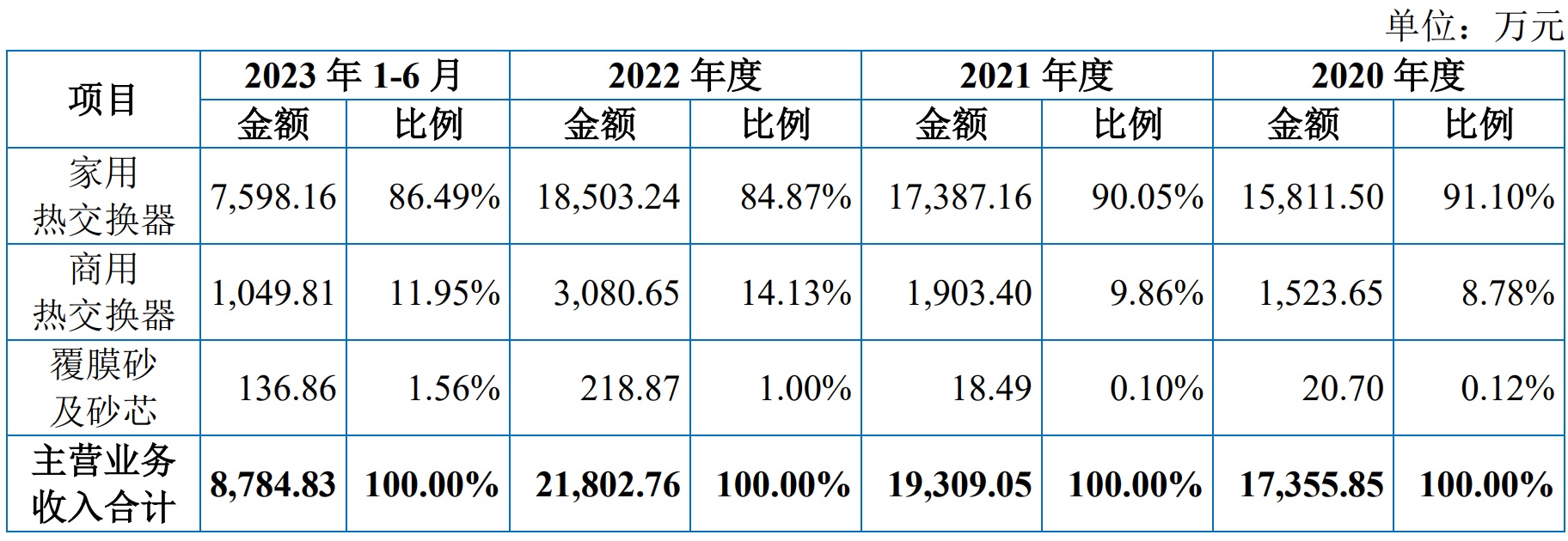按产品类型划分,报告期内,公司主营业务收入主要来源于家用铝合金冷凝式热交换器。2020年、2021年、2022年及2023年1-6月,公司家用铝合金冷凝式热交换器收入占主营业务收入的比例分别为91.10%、90.05%、84.87%、86.49%。