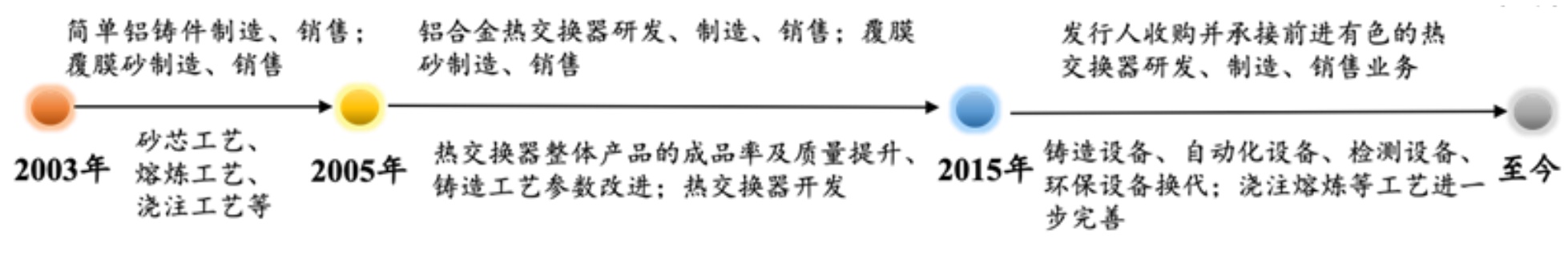 前进科技2015年设立后,收购了前进有色及其全资子公司中超机械的相关经营性资产,承接了前进有色热交换器的研发、生产和销售业务。前进有色及公司主营业务、主要产品的演变过程如下: