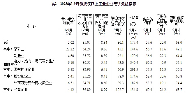 9月末,规模以上工业企业每百元资产实现的营业收入为80.1元,同比减少5.8元;人均营业收入为177.4万元,同比增加6.0万元;产成品存货周转天数为20.0天,同比增加1.2天;应收账款平均回收期为63.0天,同比增加5.9天。