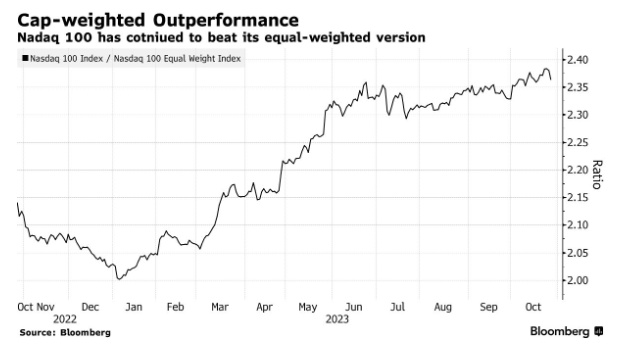目前,以市值加权的纳指较上年同期仍上涨29%,而等额加权的纳指则上涨了11%。