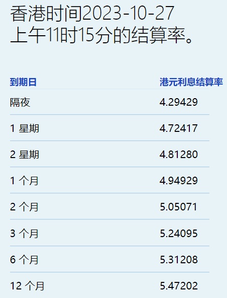 智通财经APP获悉,10月27日,港元拆息普遍上升,其中,隔夜息两连升,报4.29429%,三个月拆息在连跌两天后,亦反弹至5.24095%,为10月18日以来最高,但与楼按相关的一个月拆息则维持4.94929%。一周拆息结束四连升,保持于4.72417%逾一周高位。长息方面,六个月期维持5.31208%,一年期则升至5.47202%。