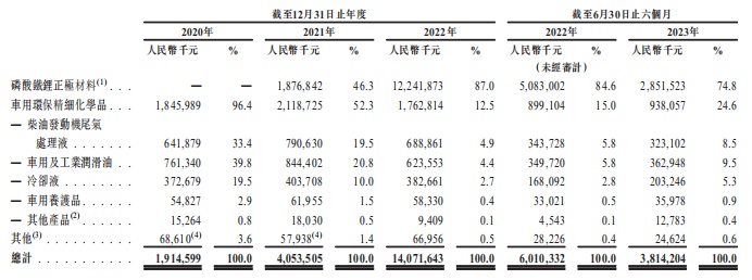 值得一提的是,与如今公司的大部分收入来源于磷酸铁锂正极材料不同,早年间龙蟠科技的业务主要集中在车用环保精细化学品领域,当中包括了生产润滑油和发动机冷却液。直到上市后的第三个年头,龙蟠科技才开始涉足磷酸铁锂正极材料业务。