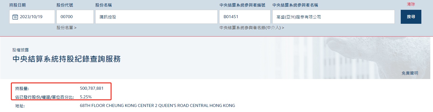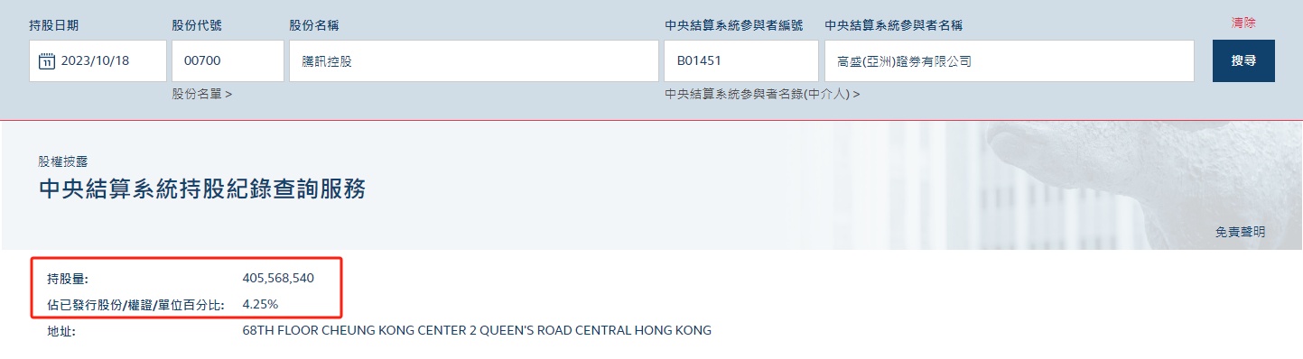 智通财经APP获悉,香港CCASS(中央结算系统)数据显示,腾讯(00700)券商席位持股出现异动,10月19日,高盛持仓单日激增9500万股,以当天收盘价计算价值约277亿港元(约合人民币259亿元)。有券商表示,目前有这个能力直接将9500万股实物股票直接转成电子股票存放在CCASS的,应该就只有Naspers(南非报业集团),这应该是减持前兆。