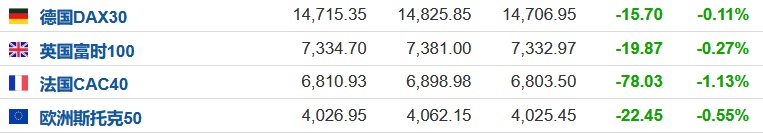 2.截至发稿,德国DAX指数跌0.11%,英国富时100指数跌0.27%,法国CAC40指数跌1.13%,欧洲斯托克50指数跌0.55%。