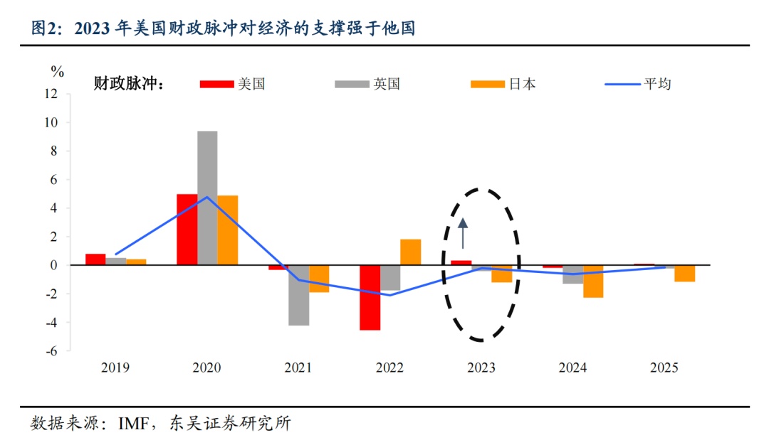 从外生的角度来看,“宽财政”抵消“紧货币”,助力美国经济的强劲上涨。这也是近期美国经济频超预期的主要原因。在2023Q1,Q2的2.2%和2.1%的经济增速中,政府支出分别贡献了0.8pct及0.6pct。虽然在今年三季度接近5%的高增下,政府支出“略有逊色”,不过依旧对三季度经济产生明显的正向刺激。有政府“兜底”的“宽财政”,也正如IMF预测,相比于其他国家,对2023年整体经济良好支撑,对冲掉了货币紧缩的冲击(图2)。