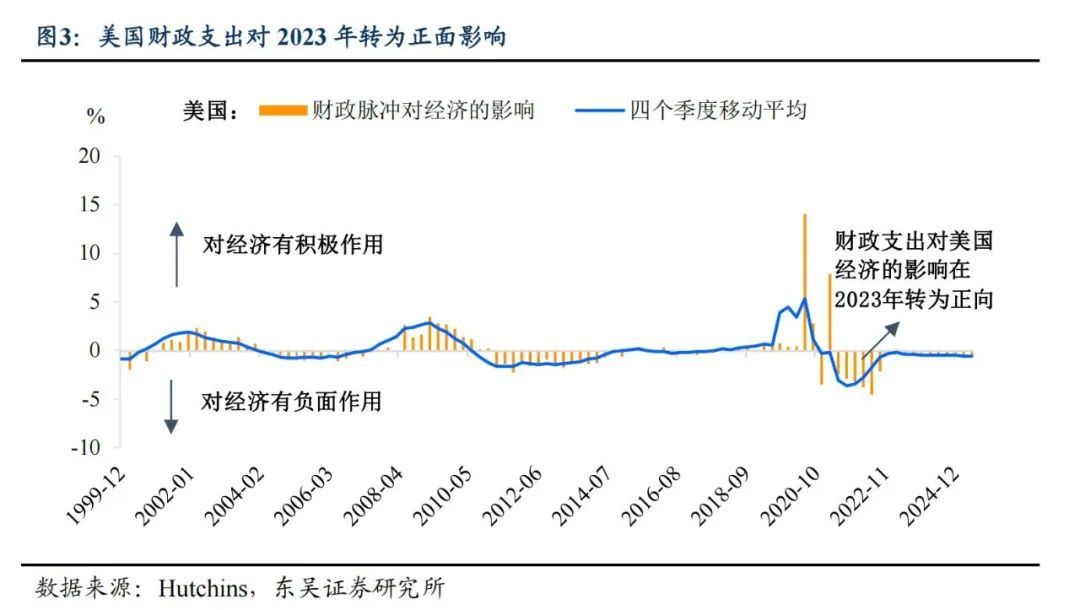 量化这一力度的话,美国Hutchins研究中心给我们提供了一些答案。从图3不难看出,政府支出在2020年对经济的支撑格外“给力”,不过随着后续财政支出力度显著降低。但这一情况在今年一、二季度又出现转机,财政支出对GDP的负面效应持续收窄,财政脉冲对经济的影响转为正面。