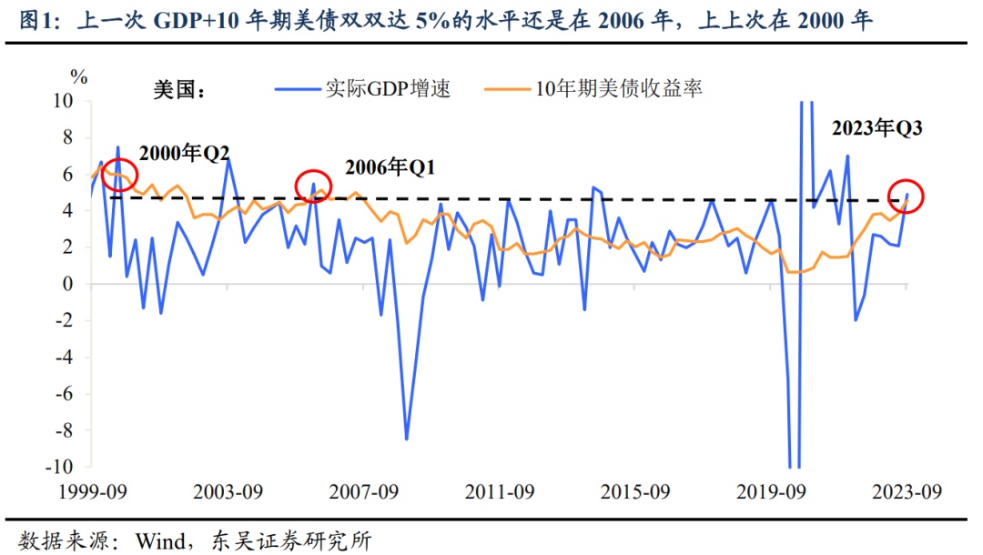 当前美国经济正经历着“地表最强”,也承受着千钧之重。即一方面是三季度4.9%的经济增速=2.5倍潜在增速;另一方面是5%的美债利率创16年来新高。这种5%+5%的组合对美国经济十分罕见:上一次出现这种情况还是在2006年一季度,随后次贷危机的风险浮出水面;更上一次是2000年二季度,正值互联网泡沫破裂的前夜(图1)。由此可见,5%的GDP增速+5%的美债利率对美国经济可谓心有余悸,尤其是在当前全球经济疲软的背景下,那么这一次又将如何演绎?