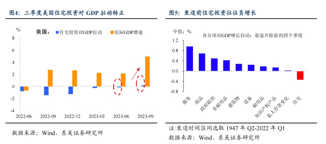 从内生的角度来看,“紧货币”并没有对利率最敏感的地产产生影响。2023年三季度美国住宅投资的转正便可以作为一大力证。三季度房地产的正增长意味着地产并没有受到525bp加息的冲击(图4)。而地产投资作为预测危机的有效指标,往往是美国经济衰退的最佳预警信号(图5)。因为历次衰退前,地产投资往往率先负增长。由此从当前来看,美国经济增长韧性延续到四季度基本没有问题。