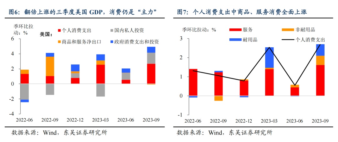 除此之外,消费无疑还是最强的。财政支持+强劲劳动力市场,支撑美国个人消费全面走强:无论是商品消费、服务消费,还是耐用品、非耐用品消费三季度均趋强(图6-7)。而这与9月大超预期的零售销售,以及汽车中二手车价格的回升,所发出的积极信号所相一致。不过,在上述强劲的因素下,学生贷款的重启支付这一意外因素,将对未来消费造成的冲击十分有限。
