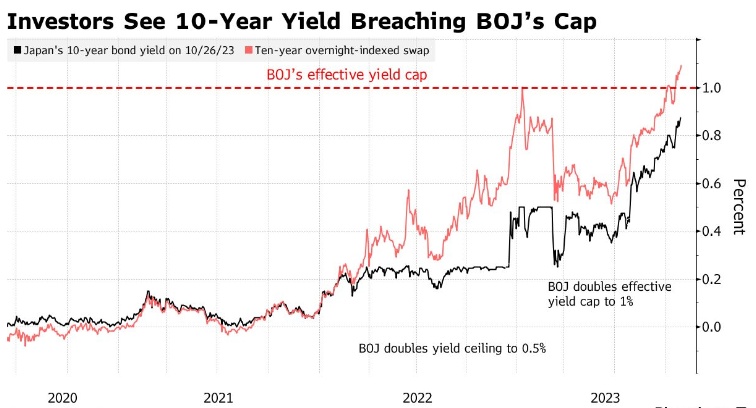 美国银行驻东京的日本货币和利率策略主管Shusuke Yamada在接受采访时表示,在即将召开的会议上,日本央行可能会将1%的实际收益率上限提高到1.5%,因为收益率已经接近目前的上限,这可能会鼓励市场参与者挑战这个水平。