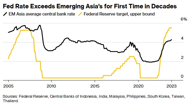 印尼和菲律宾央行在近几周已经提高了利率,并暗示可能再次收紧货币政策。星展银行高级经济学家Radhika Rao表示,弱势货币和通胀抬头的“双重打击”可能会让一些亚洲国家的央行重新收紧货币政策,“持续和巨大的贬值压力可能会说服央行重新加息”。数据显示,到目前为止,亚太地区的央行在2023年的平均加息幅度远低于发达市场的央行。