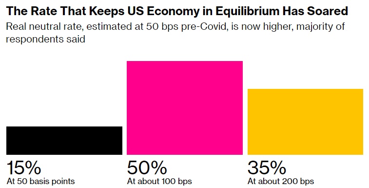 智通财经获悉,根据最新的彭博MLIV Pulse调查,美国中性利率(没有刺激也没有放缓经济的水平)在疫情过后至少翻了一番,这有理由让购买债券或股票的投资者感到紧张。在528名受访者中,约85%的人认为,所谓的实际中性利率(剔除通胀影响)已升至约100个基点或更高,而新冠疫情爆发前的估计约为50个基点。