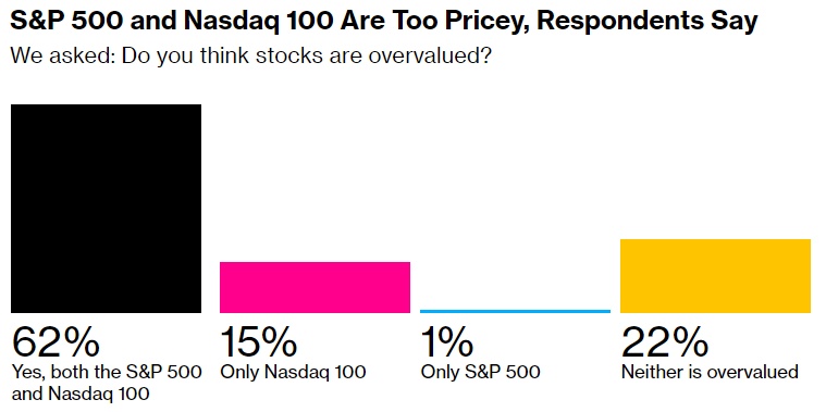 对于10年期美债,受访者预计压力不会缓解。根据受访者的预测中值,10年期美债到年底的收益率可能为5%。超过60%的受访者表示,标普500指数和纳斯达克100指数都被高估了,约15%的受访者估计,只有科技股的估值被高估了。