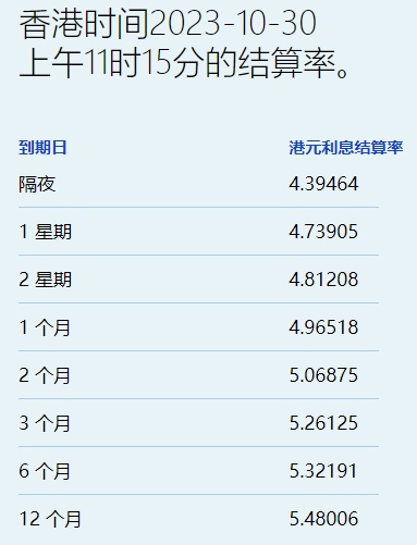 智通财经APP获悉,10月30日,香港银行公会数据显示,临近月结日,港元拆息几乎全线上升。其中,隔夜息三连升,报4.39464%,与楼按相关的一个月拆息亦升至4.96518%,齐创10月24日以来最高。一周拆息升至4.73905%,三个月拆息连升两天,报5.26125%,续创10月18日以来最高,较同期美元LIBOR低38基点。长息方面,六个月及一年期分别升至5.32191%及5.48006%。港元汇价今早在7.8209-7.8224之间,最新报7.8216,较上日收市价跌0.006%。