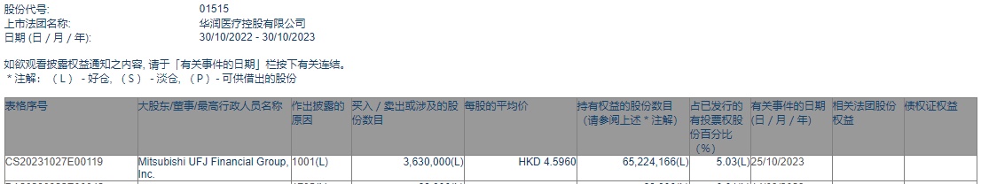Inc.增持华润医疗(01515)363万股,每股作价4.596港元,总金额约为1668.35万港元。增持后最新持股数目约为6522.42万股,最新持股比例为5.03%。