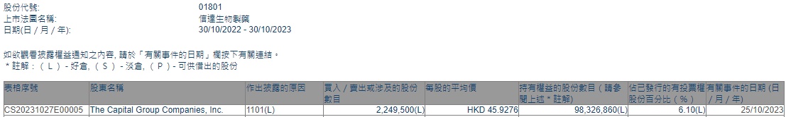 智通财经APP获悉,香港联交所最新资料显示,10月25日,美国资本集团增持信达生物(01801)224.95万股,每股作价45.9276港元,总金额约为1.03亿港元。增持后最新持股数目约为9832.69万股,最新持股比例为6.10%。