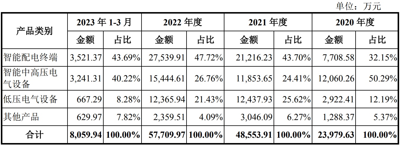报告期各期,智能配电终端、智能中高压电气设备和低压电气设备系公司主要产品,合计收入占主营业务收入的比例分别为 94.63%、93.73%、95.91%和 92.18%。