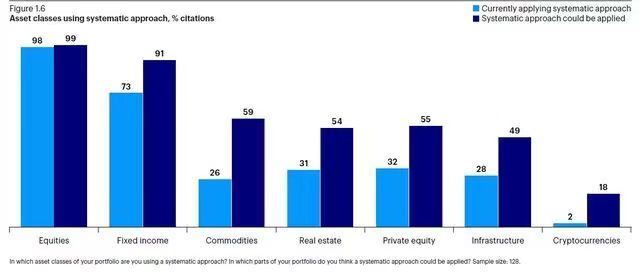 除了量化技术应用最多的股票领域外,73%的人表示他们在固定收益方面使用系统方法,91%的人认为该资产类别是一个潜在的应用领域;