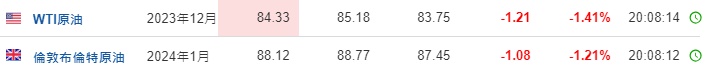 3. 截至发稿,WTI原油跌1.41%,报84.33美元/桶。布伦特原油跌1.21%,报88.12美元/桶。