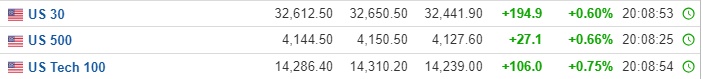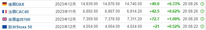 2. 截至发稿,德国DAX指数涨0.33%,英国富时100指数涨0.62%,法国CAC40指数涨1.00%,欧洲斯托克50指数涨0.52%。
