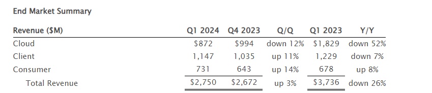 详细的业绩数据显示,西部数据Q1云计算业务持续疲软,该业务营收同比下降52%至8.72亿美元,但是同比降幅相比上一季度小幅收窄,环比降幅则为12%,该数据显示西部数据面向云服务商的硬盘和闪存产品出货量仍然相对低迷。但是面向客户群体和消费端的硬盘和闪存产品需求有所升温,当季客户业务端带来的营收环比增长11%至11.47亿美元,消费端业务营收环比增长14%至7.31亿美元。