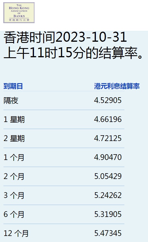 智通财经APP获悉,10月31日,港元拆息几乎全线下跌,仅隔夜息连升四天,报4.52905%,创一周新高,但与楼按相关的一个月拆息回落至4.9047%,为10月19日以来最低。一周拆息跌至4.66196%,三个月期两连升止步,报5.24262%,与同期美元LIBOR息差略为扩阔至40基点。长息方面,六个月及一年期分别回落至5.31905%及5.47345%。