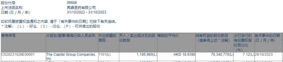 Companies,Inc.增持再鼎医药(09688)118.59万股,每股作价18.939港元,总金额约为2245.98万港元。增持后最新持股数目约为7034.08万股,最新持股比例为7.12%。