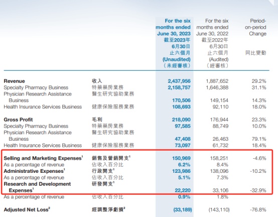 不过即便如此,思派健康在上半年的净利润仍实现了大幅收窄。原因在于,公司在总收入大增的情况下,大幅减少了包括营销、行政及研发等在内的费用端支出。其中公司营销费用同比减少4.6%,行政费用同比减少10.2%,而研发费用则大幅减少32.9%。一增一减之下,公司经调整净亏损同比大幅收窄76.8%至3318.9万元。