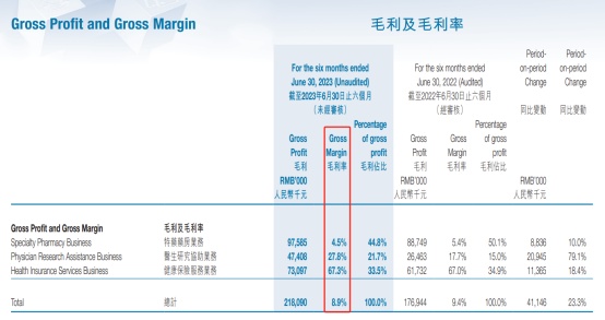 从业务收入结构可以看到,特药药房业务在收入占比上远高于其他两项业务,然而特药药房业务的毛利占比却仅为44.7%,毛利率甚至只有4.5%。而当期公司整体毛利虽同比增长23.3%,但绝对值仅有2.18亿元,而对应毛利率则仅为8.9%,甚至同比下降了0.5个百分点。而这也符合当前国内DTP药房市场的发展特点,即市场越透明,利润空间越有限。