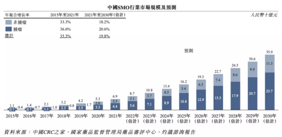 以肿瘤SMO业务为例,从市场空间来看,中国SMO服务市场规模由2015年的11亿元增加至2021年的69亿元,年复合增长率为35.3%,预期于2025年将进一步达到162亿元,2021年至2025年的年复合增长率将为23.8%,及于2030年达到350亿元,2025年至2030年的年复合增长率将为16.7%。