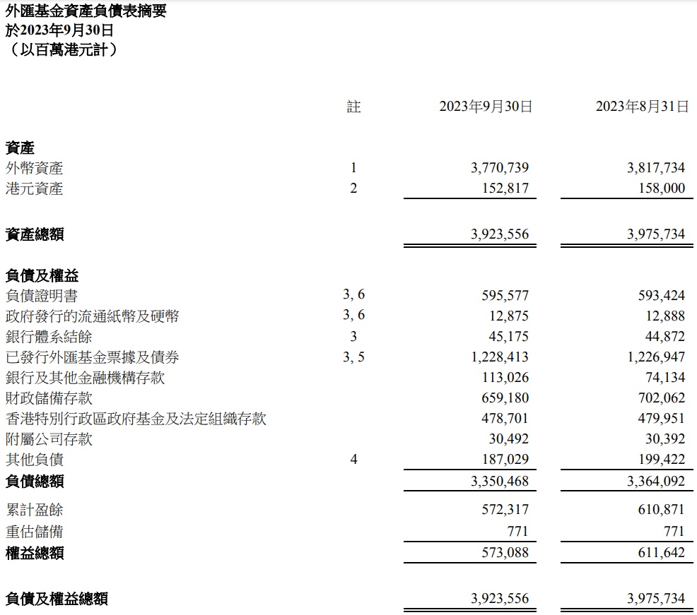 货币发行局帐目显示,2023年9月底的货币基础为18811亿港元,较2023年8月底增加46亿港元,增幅为0.2%。货币基础增加,主要是由于负债证明书总额有所上升及未偿还外汇基金票据及债券的市值增加。