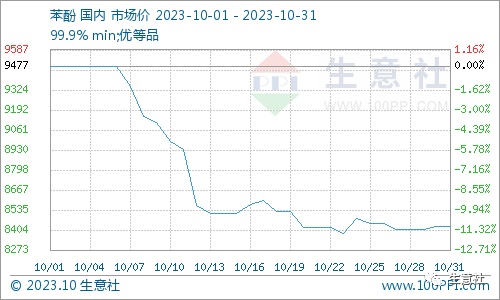 智通财经APP获悉,10月份国内苯酚市场总体下行为主。据生意社商品行情分析系统,月初国内苯酚市场报盘在9477元/吨,月末市场震荡下跌至8425元/吨,跌幅达11.10%。