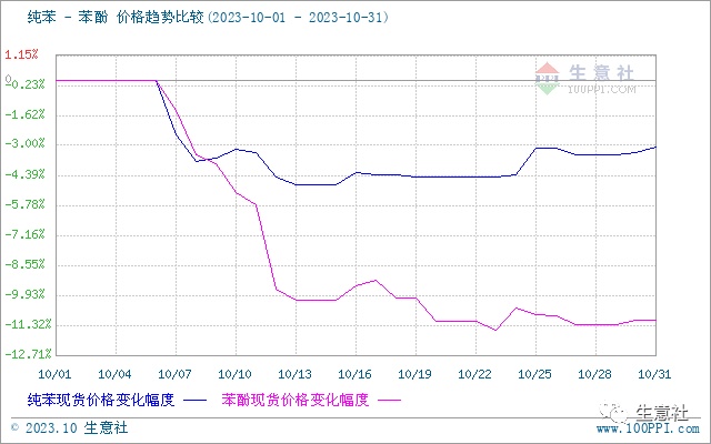 成本面:进入十月份受国庆期间原油大跌影响,原料纯苯价格大幅下行,苯酚受成本面利空影响,贸易商让利出货意向增加,尽管工厂方面挂牌价格坚挺意向维持,但市场在整个需求面不佳的情况下大幅走跌,终端工厂多刚需跟进,难有大单需求入市,华东市场商谈重心迅速跌破8500元/吨。随着原油拉动纯苯价格止跌回升,且在苯酚自身社会供应量无压力的情况下,贸易商试探性推涨报盘,中下旬苯酚市场在涨涨跌跌中运行,苯酚市场盘面整体维持在区间内,并未出现大幅波动。