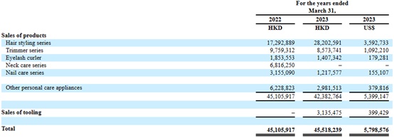 从收入结构来看,发型设计系列、修剪器系列显然是公司收入的顶梁柱,而在2023年,其品类也发生了一些波动。总收入的小幅增长主要因其发型系列和新产品收入的显著增长,这些收入来自于为客户制造多种工具、模具和装配设备,作为产品计划的一部分,但由于市场趋势,上一财政年度推出的新产品系列——颈部护理系列的停止销售,抵消了这一增长。