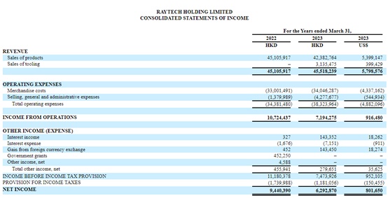 在过去的2022财年、2023财年(财年截至日期为3月31日),雷特控股的收入分别为4510.59万、4551.82万港元,基本保持持平,未见太大的波动或增长。但其相应期间内,净利润则由2022财年的944.04万骤降至629.29万港元,同比降幅达到33.3%,而该公司将净利润的下降主因归于运营费用的增加。