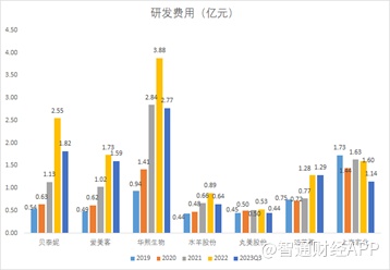 为持续提升在行业中的竞争地位,近年来贝泰妮持续提高研发费用。Wind数据显示,2019年,贝泰妮的研发费用仅0.5亿元,在同行可比公司中,处于中下水平。在为科技创新赋能的当下,贝泰妮加大研发投入,至2023年前三季度便达到1.82亿元,同比增长43.88%,研发费用总额位居同行可比公司第二,增速第一。