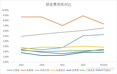 从研发费用率角度来看,在2021年之前,贝泰妮的研发费用率与多数可比公司基本持平,不过在大部分企业研发费用率并没有增加,甚至下降的情况下,2022年贝泰妮研发费用率大幅攀升,至2023年Q3其研发费用率达到5.3%,大幅领先于多数同行企业。