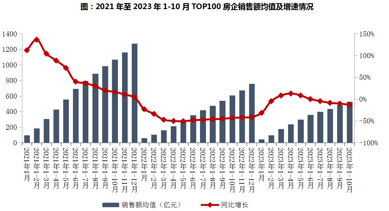 图:2021年至2023年1-10月TOP100房企销售额均值及增速情况